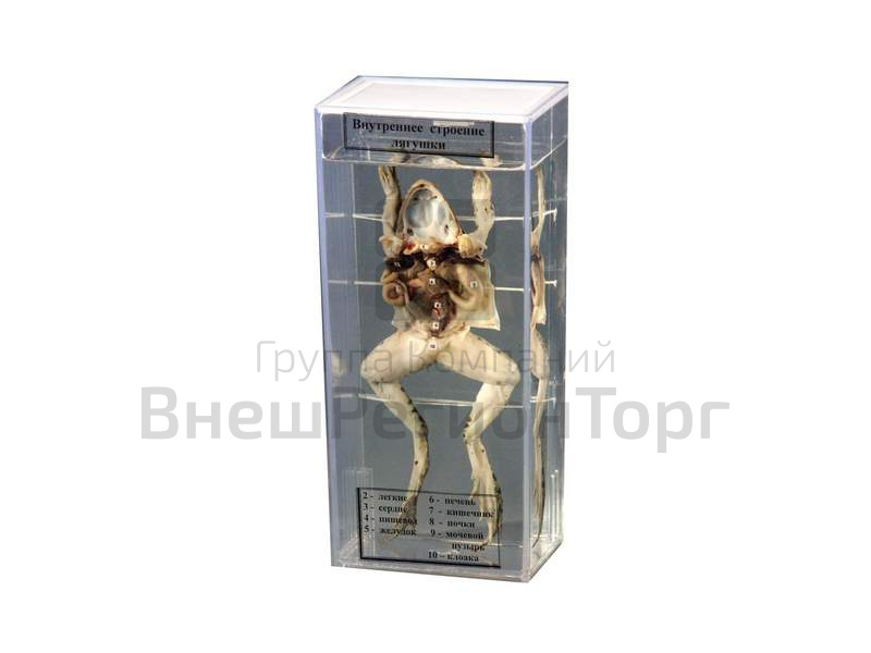 Препарат смонтирован на стеклянной пластине, которая помещена в сосуд с консервирующей жидкостью. Пластина закреплена в пазах сосуда и крышки. Сосуд герметично закрыт. На препарате представлена лягушка, вскрытая с брюшной стороны. В результате препарирования расположение органов немного изменено с целью более удобного их рассмотрения. Цвет органов несколько изменен за счет влияния консервирующей жидкости.