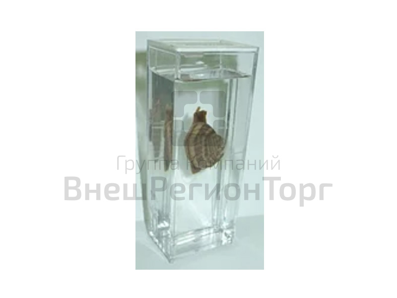 На препарате представлена виноградная улитка - представитель наземных брюхоногих моллюсков из отряда Pulmonata (легочные улитки), которые относятся к семейству Helicidae (хелициды). Внешне улитка состоит из туловища и раковины. При этом мягкую часть разделяют на голову с двумя парами щупалец и ногу. Внутренние органы окружены мантией, часть которой видна снаружи. На препарате показана виноградная улитка с раковиной и выдвинутой вперед головой с двумя парами щупалец.