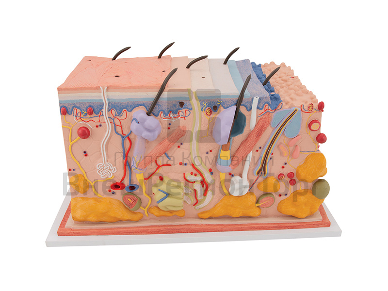 Модель кожи в виде блока показывает слои кожи и их структуры. Наряду с изображением каждого слоя изображены также волосы, корни волос, потовая и сальная железы, рецепторы, нервы и кровеносные сосуды. На подставке.