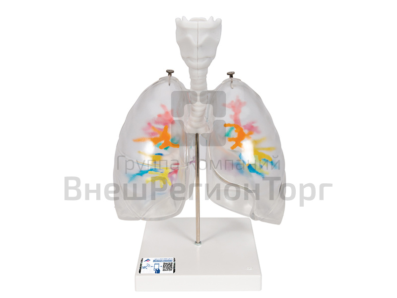Гортань с подъязычной костью, надгортанник, трахея с главными и долевыми бронхами выполнены в одном цвете. Гортань можно снять с модели на уровне второго хрящевого кольца трахеи и разделить посередине. Крепление надгортанника гибкое. Сегментные бронхи сделаны из эластичного прозрачного материала, и для наглядности выполнены в разных цветах. Легкие из прозрачного материала, съемные.
