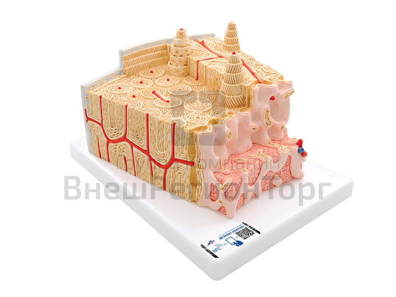 Эта модель позволяет увидеть графическое представление взаимосвязи отдельных компонентов, таких как губчатое и компактное вещество кости, эндост, корковое вещество, остеоциты, фолькмановские и гаверсовы каналы. Модель имеет подставку.
