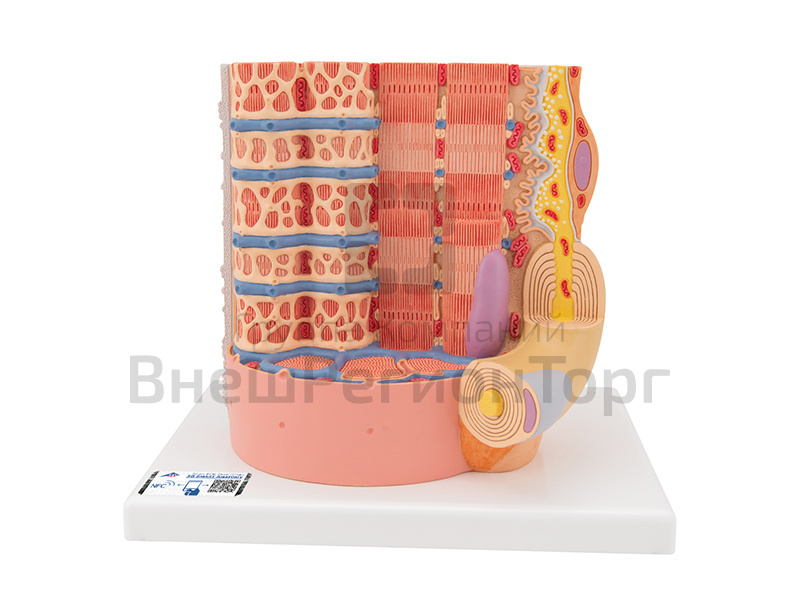 Модель демонстриурет сечение волокна скелетных мышц. Нервно-мышечная концевая пластинка увеличена приблизительно в 10 000 раз. Мышечное волокно является основным элементом скелетной поперечно-полосатой мышцы.
