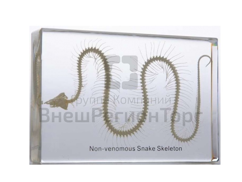 Пособие представляет собой законсервированный в пластмассовом блоке методом холодной полимеризации скелет змеи.