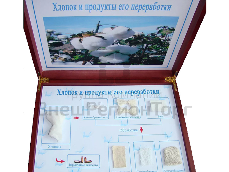 В коллекции представлены образцы хлопка, ваты, хлопкового волокна, хлопчатобумажной пряжи, ткани, изделий, нитей. Коллекция сопровождается схемой и пояснениями по технологии переработки хлопка.