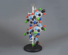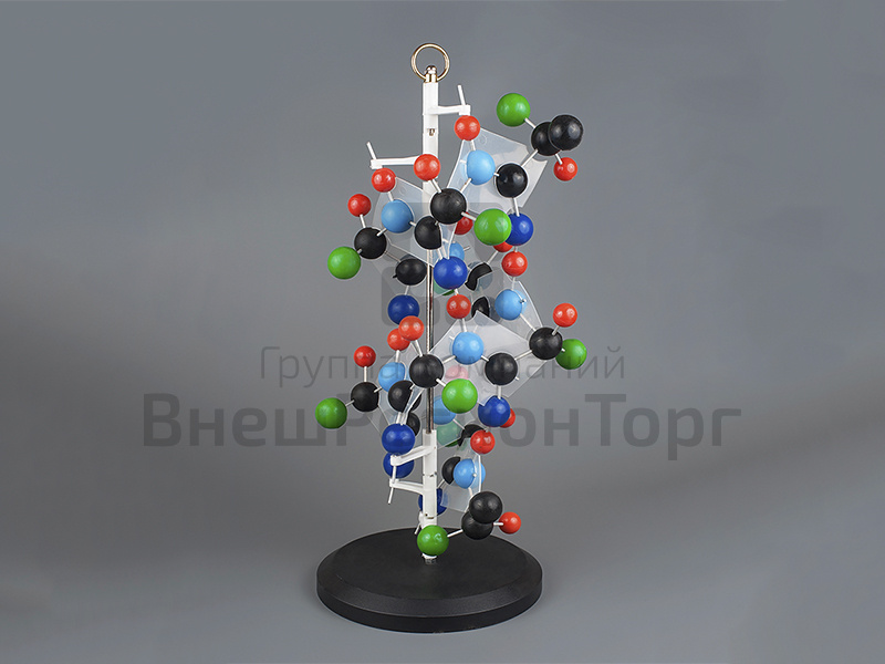 Атомы из которых строится белковая молекула (углерод, водород, азот, кислород), обозначены на модели разным цветом, также представлен участок пептида (аминокислоты) не принимающий участия в образовании химических связей в молекуле белка – радикал. Модель собрана на металлической оси с подставкой. Изделие упаковано в коробку с маркировкой.