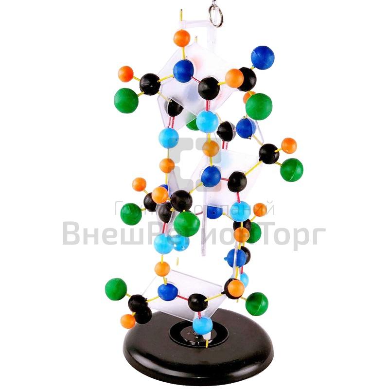 Атомы из которых строится белковая молекула (углерод, водород, азот, кислород), обозначены на модели разным цветом, также представлен участок пептида (аминокислоты) не принимающий участия в образовании химических связей в молекуле белка – радикал. Модель собрана на металлической оси с подставкой. Изделие упаковано в коробку с маркировкой.