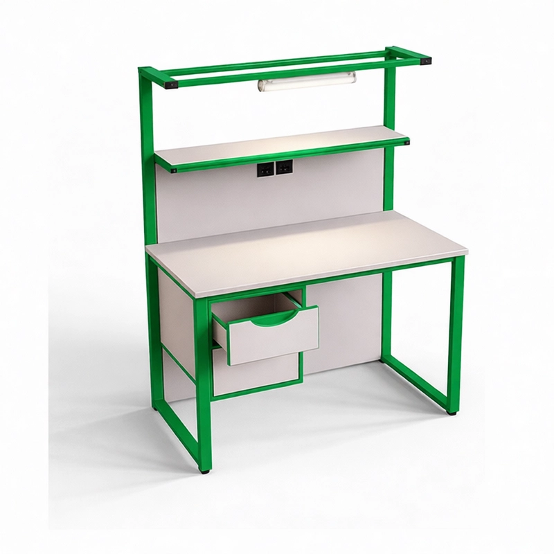 Столешница - 26 мм (покрытие пластик светло-серый), экраны ЛДСП - 16 мм. Кромка - 0,4 и 2 мм. М/каркас 50*25 и 25*25 мм, Цвет м/каркаса: Зеленый, Оранжевый, Синий.