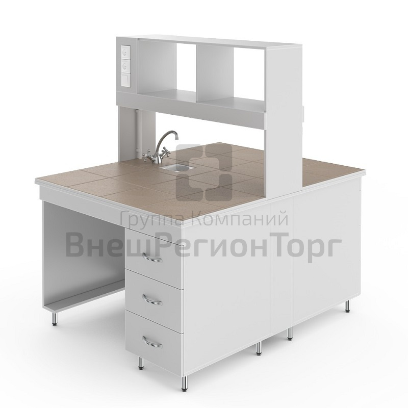 Островной стол с сантехникой и надстройкой. Его можно поставить в центре лаборатории и организовать два полноценных рабочих места. Столешница глубиной 152 см. В надстройку с каждой стороны встроена лампа и две розетки. Предназначен для работы стоя: высота от пола до столешница равна 85 см.
