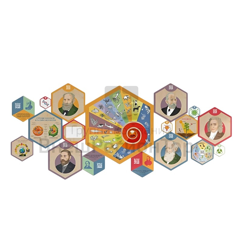 Образовательные панели по биологии для оформления стен школьных учреждений. Выполняют две функции: декор и соответствующее предмету обучение. Комплект состоит из набора гексагонов различного размера, которые можно комбинировать, исходя из вашего желания и конфигурации стен. Можно составить оригинальный дизайн, сочетая все шестигранники, а можно повесить их по отдельности.