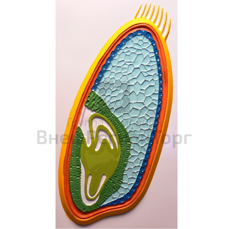 Модель изготовлена из пластмассы путём вакуумного формования. На модели рельефом и цветом показаны следующие детали строения семени:
