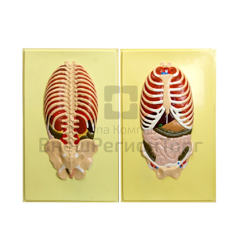 Модель изготовлена из пластмассы путём вакуумного формования. В комплект входят 2 планшета, на которых изображено расположение внутренних органов в грудной и брюшной полостях тела человека. На одной модели расположение органов демонстрируется с брюшной стороны, а на другой – со спинной.
