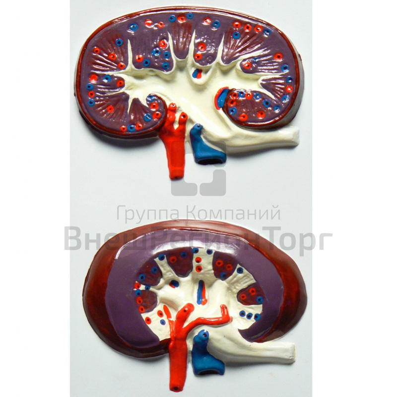 Модель изготовлена из пластмассы, путем вакуумного формования. На ней изображена почка человека и ее сагиттальный разрез. Модель позволяет рассмотреть следующие особенности внешнего и внутреннего строения почки человека: