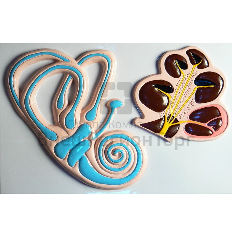 Модель изготовлена из пластмассы путем вакуумного формования. На барельефной модели можно рассмотреть следующие детали строения внутреннего уха человека: