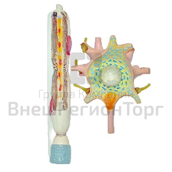 Модель цветная, изготовлена из пластмассы и установлена на подставке. Модель состоит из двух частей: первая имитирует строение нервной клетки (нейрона), вторая – строение нервного отростка (аксона). На модели нервной клетки (нейрона) представлены следующие элементы: тело нейрона с отростками (дендритами), базальные тельца, ядро с ядрышками, нейрофибрилл. На модели аксона представлены: миелиновая оболочка отростка, нейрофибриллы, клетки Шванна, перехваты Ранвье.
