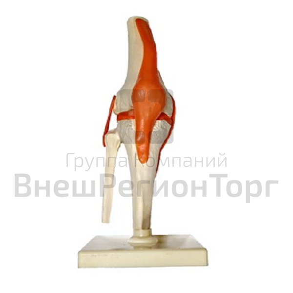 Модель изготовлена из пластмассы, связки из резины, устанавливается на подставку. Представляет собой коленный сустав в натуральную величину, что позволяет рассмотреть строение: бедренная кость, коленная чашечка, большая берцовая кость, малая берцовая кость, связки.