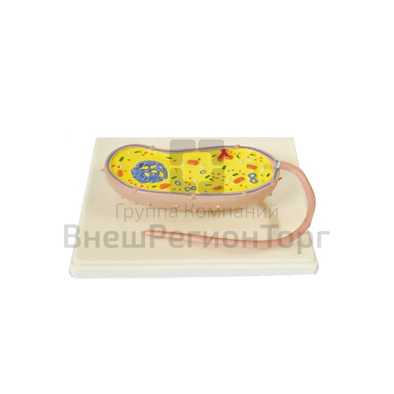 Модель неразборная, цветная, изготовлена из пластмассы и закреплена на подставке. На модели можно рассмотреть следующие особенности строения клетки бактерии: