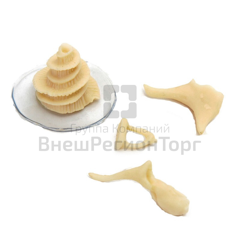 Комплект изготовлен из пластмассы. Представляет собой увеличенные слуховые косточки: молоточек, наковальня, стремечко и улитка. Улитка помещена в полупрозрачный пластмассовый чехол, который создает имитацию жидкости, в которой располагается улитка.