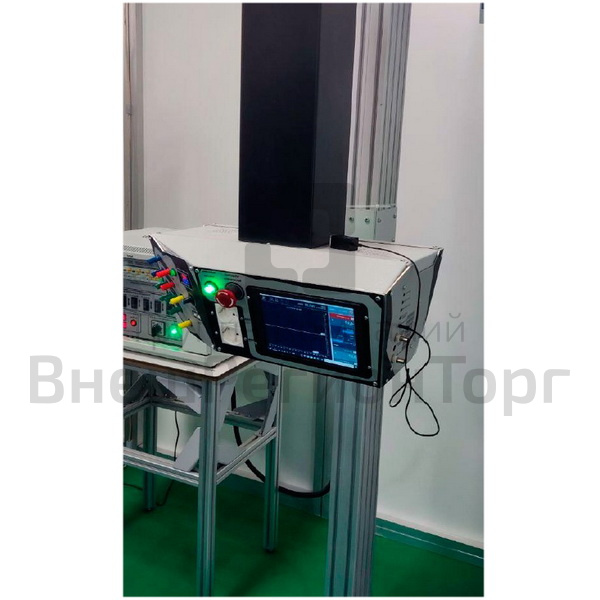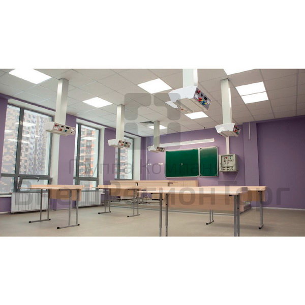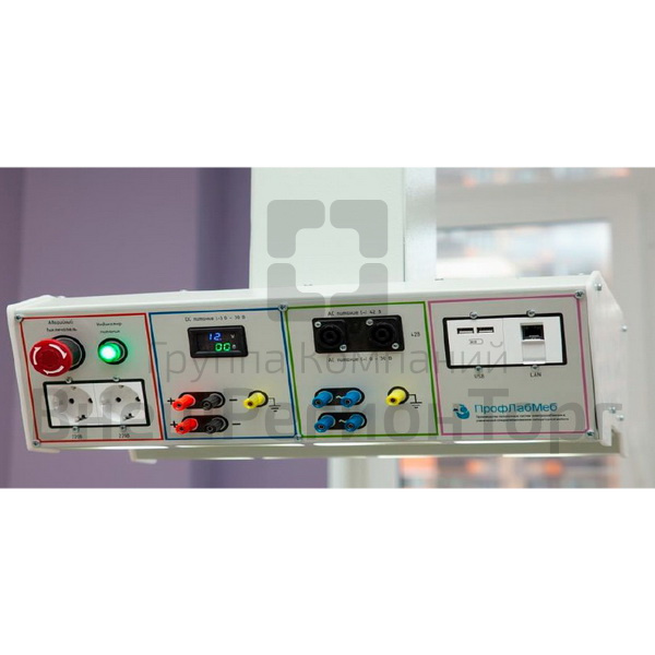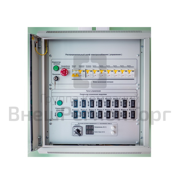- управления подъемом и опусканием потолочных модулей: одновременно, по группам или по отдельности каждый модуль кнопка аварийного выключения электроснабжения. Комплект коммуникаций для подключения системы. Устройство имеет дисплеи для отображения силы тока и напряжения постоянного тока. Устройство выдает постоянный и переменный ток для подачи тока на потолочные модули электроснабжения учеников. Устройство имеет регулятор выдаваемого напряжения. Выходное напряжение переменного тока, В.: от 0 до 42 В. Выходное напряжение постоянного тока, В.: от 0 до 32 В. "