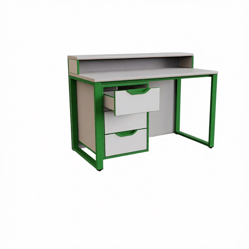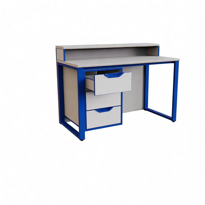 Столешница - 26 мм (покрытие пластик светло-серый), экраны ЛДСП - 16 мм. Кромка - 0,4 и 2 мм. М/каркас 50*25 и 25*25 мм, Цвет м/каркаса: Серый, Зеленый, Оранжевый, Синий, Черный, Белый.