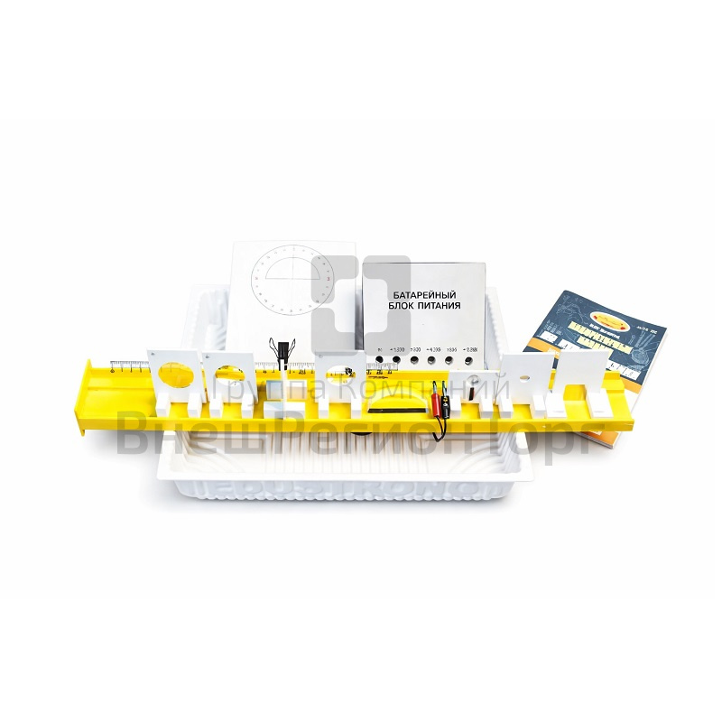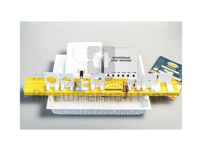 Состав комплекта: батарейный блок питания 1,5 ÷7,5 В (регулируемый) – 1 шт., батарейки (тип АА) – 5 шт., собирающая линза № 1, фокусное расстояние F1=(100±10) мм - 1 шт., собирающая линза № 2, фокусное расстояние F2=(50±5) мм - 1 шт., рассеивающая линза № 3, фокусное расстояние F3=-(75±5) мм - 1 шт., линейка длиной 300 мм с миллиметровыми делениями - 1 шт., экран с держателем - 1 шт., направляющая (оптическая скамья пластиковая с бортиками для соосности оптических элементов и фиксатором для края стола) - 1 шт., осветитель-светодиод белого света с двумя проводами (красным и черным) - 1 шт., фиксатор провода к оптической скамье - 1 шт., слайд "Модель предмета" (буква F) - 1 шт., щель - 1 шт., полуцилиндр, диаметр (50±5) мм, показатель преломления примерно 1,5 - 1 шт., планшет с круговым транспортиром и с обозначением места для полуцилиндра - 1 шт., лоток пластиковый размером 340*270*55 мм - 1 шт., учебное пособие «Лабораторные наборы по курсу физики» (автор Е.Ю. Косарева – 68 страниц – печать офсетная, обложка полноцветная) – 1 шт., руководство по эксплуатации - 1 шт.