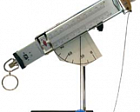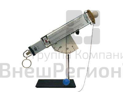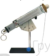Пистолет баллистический сконструирован на базе динамометра. Динамометр двухсторонний, имеет шкалу с нулем посередине и пределы измерения в обе стороны 10Н, цена деления шкалы - 0,2Н. Стрелочный указатель может перемещаться вдоль шкалы по направляющим, точная установка указателя против деления шкалы осуществляется винтом. На концах направляющих закреплена круглая площадка. Для установки снаряда (шарика) на ней расположены два штыря. В сжатом состоянии пружина динамометра удерживается с помощью проволочного крючка. Для определения угла наклона прибора служит транспортир с ценой деления 150 с отвесом. При использовании прибора в качестве динамометра к площадке прицепляют крючок для подвешивания грузов. При проведении лабораторных работ прибор закрепляют на штативе с помощью стержня и муфты.