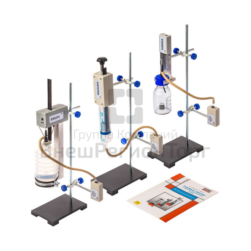 Набор демонстрационный позволяет обучать основным этапам проведения экспериментального исследования, а также позволяет проводить с учениками совместные исследования. В состав набора входят три установки для осуществления изотермического, изобарного и изохорного процессов, которые имеют встроенные датчики объема и температуры, позволяющие регистрировать параметры газа в процессе изменения его состояния. Конструкция установок обеспечивает постоянство одного из параметров газа при варьировании двух других параметров. Для измерения давления газа применяется датчик абсолютного давления.