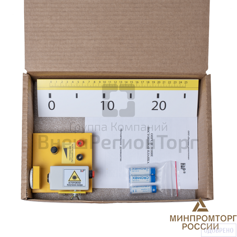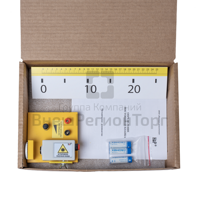 Набор демонстрационный "Определение постоянной Планка" состоит из платформы, на которой смонтированы полупроводниковый лазер и электрическая цепь, обеспечивающая плавную регулировку напряжения питания, дифракционной решетки и линейки, на которой производится регистрация дифракционного спектра.