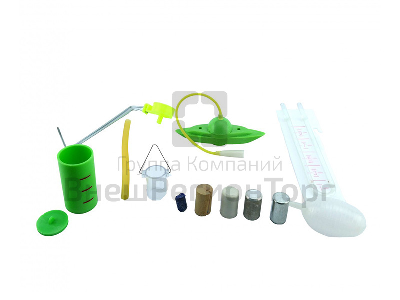 Набор включает в себя резервуар для воды, мембранный узел с комплектом крепления, цифровой датчик давления (дифференциальный), ведерко Архимеда, тело цилиндрической формы, отливной стакан, пружинный динамометр (датчик силы), груша с клапаном и трубкой, сосуд с утяжелителем.
