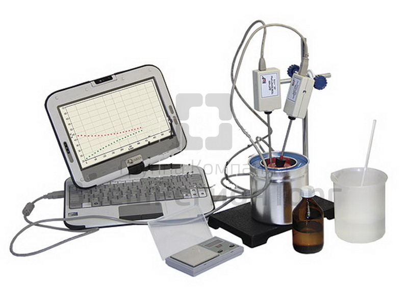 В состав комплекта входит специальный сосуд, фиксируемый на трубке датчика температуры, что позволяет вести эксперимент по теплообмену с постоянным перемешиванием двух жидкостей и одновременной фиксацией их температур.
