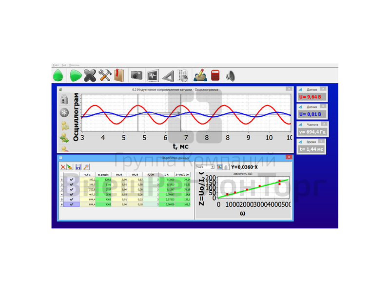 На рисунках представлены принципиальная схема для изучения индуктивного сопротивления катушки, размещение элементов набора на магнитной доске и экран работы с данными, получаемыми от осциллографического датчика напряжения, включающий осциллограмму напряжения на катушке индуктивности и резисторе, таблицу амплитуд колебаний и график зависимости индуктивного сопротивления от частоты с аппроксимирующей экспериментальные данные линейной зависимостью.