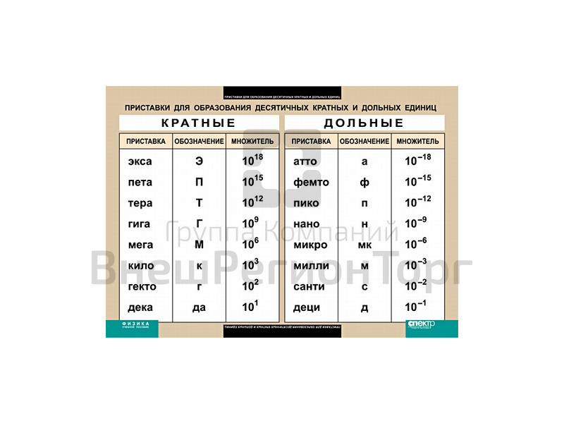 Подробное описание Таблица 100х140 "Приставки для образования десятичных кратных и дольных единиц"