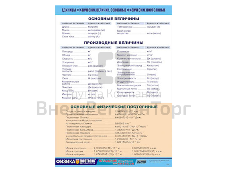 У нас вы можете купить Таблица демонстрационная Единицы физических величин. Основные физические постоянные, 100х140, сравнить цены, получить прайс-лист, получить отзывы реальных покупателей. Мы соответствуем требованиям ФГОС, ГОСТ и СанПиН. Мы работаем на основании федеральных законов No44-ФЗ и No223-ФЗ.