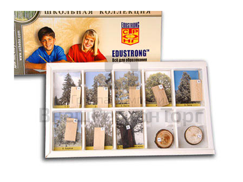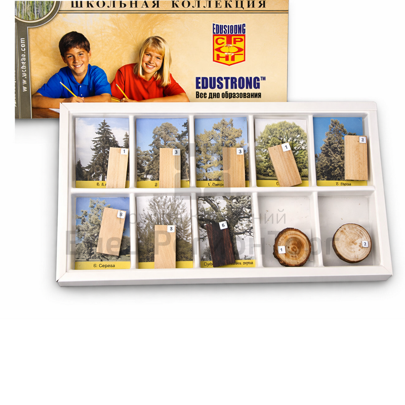 СОСТАВ: образцы древесин (продольные срезы) – 8 шт., образцы древесин (поперечные срезы) – 2 шт., фотографии растений – 8 шт., руководство по эксплуатации – 1 шт.