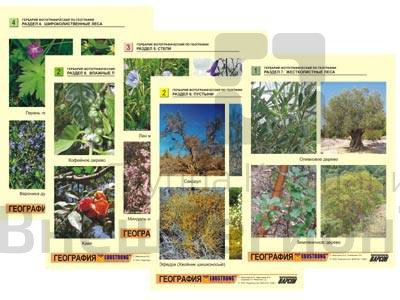 В комплект входят 32 листа с описаниями по разделам: "Арктические пустыни. Тундры", "Хвойные леса. Широколиственные леса", "Степи. Пустыни", "Жестколистные леса. Саванны. Влажные тропические леса".