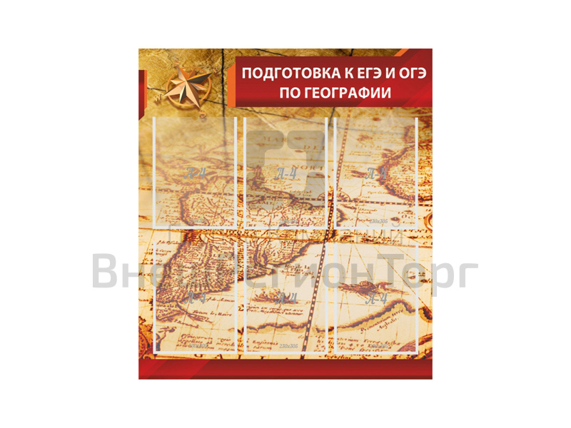 Стенд "Подготовка к ЕГЭ и ОГЭ по географии" с 6 карманами Материал: пластик ПВХ 3мм, пленка с фотопечатью 720 dpi, ламинирующая пленка. Карманы - ПЭТ 0,5 мм, крепление на двусторонний скотч.