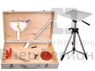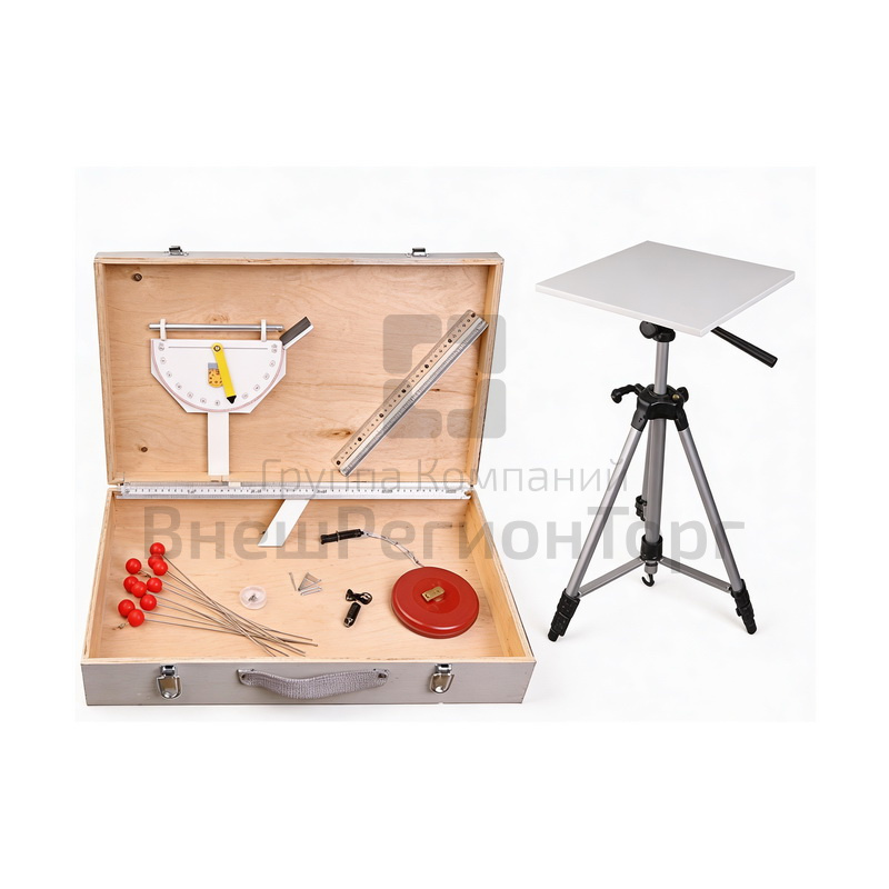 Комплектность: мензула – 1 шт., визирная линейка – 1 шт., вертикальный угломер – 1 шт., дальномер – 1 шт., компас – 1 шт., рулетка – 1 шт., колышки – 10 шт., шпильки – 8 шт., отвес для мензулы – 1 шт., ящик для хранения и транспортировки топографических инструментов и приборов – 1 шт., руководство по эксплуатации – 1 шт.