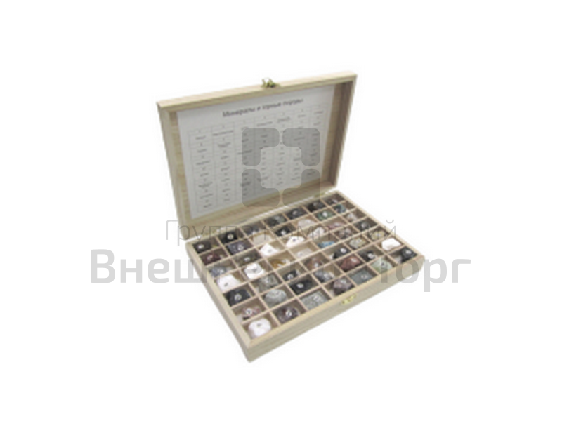 В состав входит 49 образцов минералов и горных пород: магнезит, делафоссит, магнетит, гематит, боксит, ванадий, гранат, мрамор белый, тальк, кварц, доломит, гипс, халцедон (кремень), графит, каменный уголь (антрацит), базальт, гранит, сланец, песчаник, кислые горные породы, известняк и другие образцы.