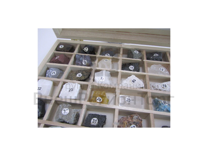 В состав входит 49 образцов минералов и горных пород: магнезит, делафоссит, магнетит, гематит, боксит, ванадий, гранат, мрамор белый, тальк, кварц, доломит, гипс, халцедон (кремень), графит, каменный уголь (антрацит), базальт, гранит, сланец, песчаник, кислые горные породы, известняк и другие образцы.
