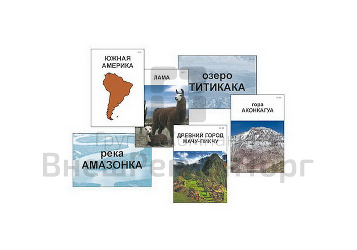 Пособие знакомит учащихся с материками: Евразией, Африкой, Северной Америкой, Южной Америкой, Австралией и Антарктидой. Набор карточек для каждого материка включает следующие изображения: название с контуром материка; высочайшую вершину; крупнейшие озеро и реку; типичное животное, обитающее на данном материке; уникальный природно-культурный объект. В категории «озёра» для Антарктиды представлено подледниковое озеро Восток; карточка категории «реки» для этого материка отсутствует, поскольку на материке в летний период образуются только временные водотоки в результате таяния ледников.