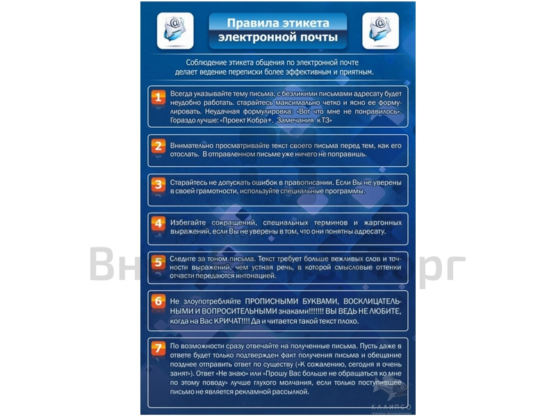 У нас вы можете купить Стенд Правила этикета электронной почты, сравнить цены, получить прайс-лист, получить отзывы реальных покупателей. Мы соответствуем требованиям ФГОС, ГОСТ и СанПиН. Мы работаем на основании федеральных законов No44-ФЗ и No223-ФЗ.