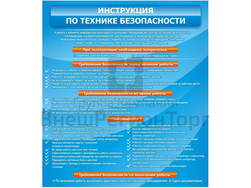 У нас вы можете купить Стенд Инструкция по технике безопасности, сравнить цены, получить прайс-лист, получить отзывы реальных покупателей. Мы соответствуем требованиям ФГОС, ГОСТ и СанПиН. Мы работаем на основании федеральных законов No44-ФЗ и No223-ФЗ.