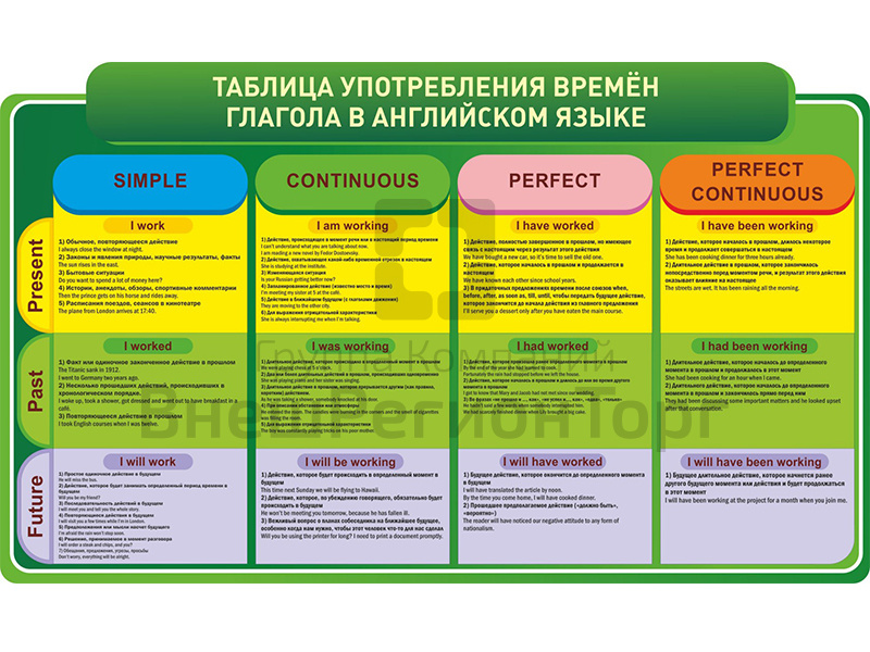 Яркая и понятная таблица подскажет Вашим ученикам правила устного и письменного употребления глаголов четырёх основных времен в английском языке. Выразительная, но не излишне яркая маркировка, позволит очень быстро найти в знакомом стенде нужно подсказку.