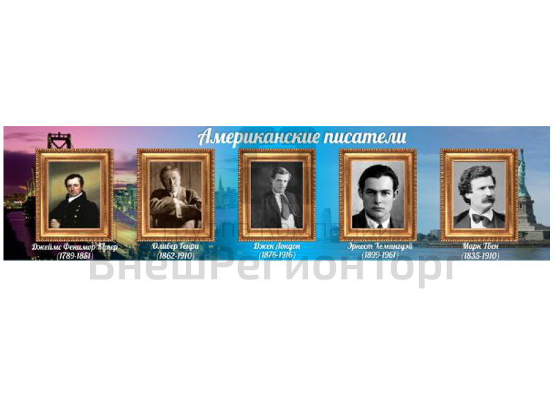 На этом стенде изображены одни из самых известных американских классиков: Джеймс Фенимор Купер, Оливер Генри, Эрнест Хемингуэй и Марк Твен и годы жизни этих великих писателей.