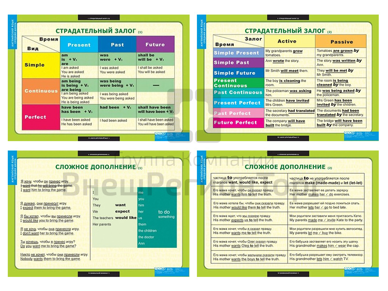 Подробное описание Набор таблиц по английскому языку Страдательный залог. Сложное дополнение. Косвенная речь 9 шт.