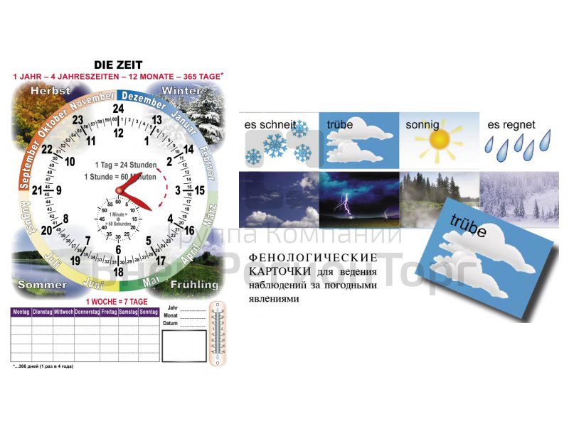 В комплекте: 1 таблица с подвижными стрелками, 8 карточек (фенологические карточки), липучки для крепления к таблице