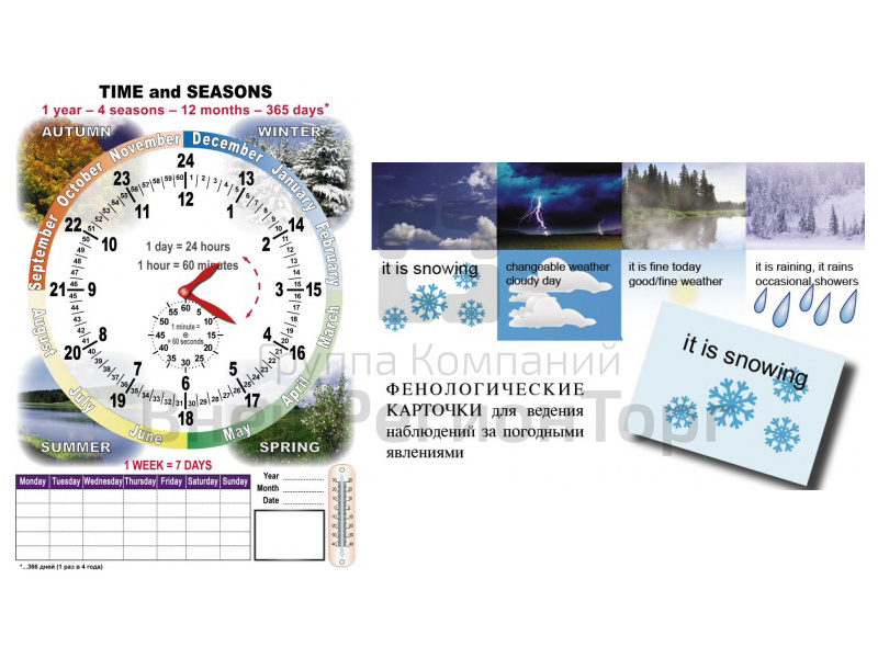 В комплекте: 1 таблица с подвижными стрелками, 8 карточек (фенологические карточки), липучки для крепления к таблице