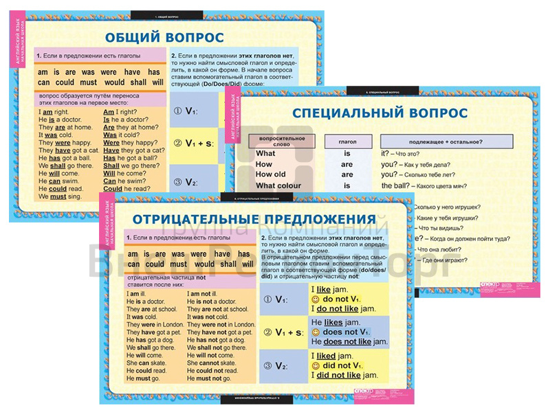 Подробное описание Набор таблиц по английскому языку Вопросительные и отрицательные предложения 8 шт.
