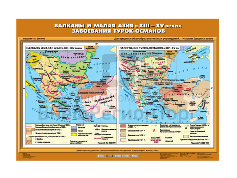 Подробное описание Учебная карта "Балканы и Малая Азия в XIII-XV вв. Завоевания турок – османов"