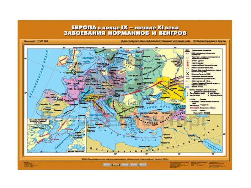 Подробное описание Учебная карта "Европа в конце IX-начале XI вв. Завоевания норманнов и венгров"