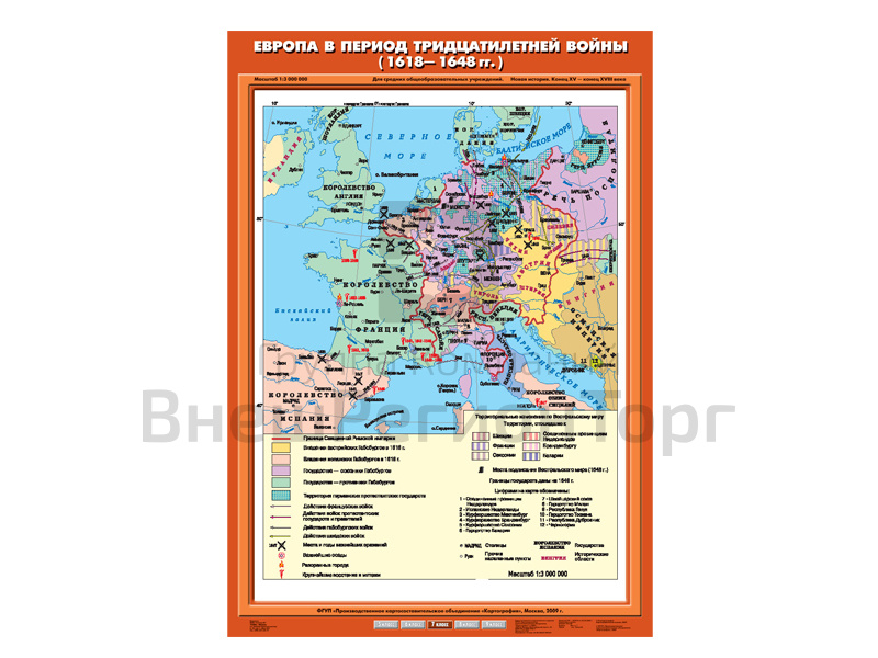 Подробное описание Учебная карта "Европа в период Тридцатилетней войны 1618-1648 гг."
